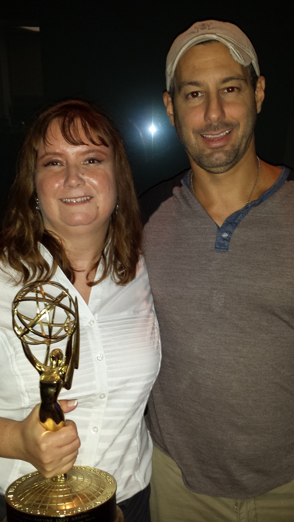 We grabbed our stuff, made a quick swing by Jerry’s Deli, before heading back to let poor DaVinci out for a bathroom break 🙂 Jerry’s Deli is most yummy! Had ham and cheese sandwich with TONS of ham on it and fries. When we walked in, I was so torn as to what to do first: get out of makeup, get into comfy clothes, or eat! Did a quick photo shoot while I was still in makeup with Scott & Lesli’s Emmy. It’s a pretty hefty statue! More than what I was really expected. It was super sweet of Lesli to suggest the picture!